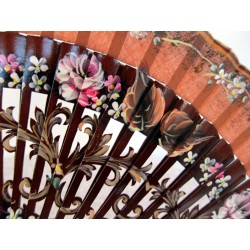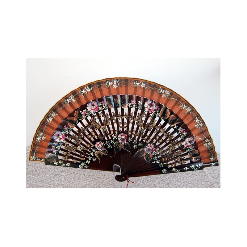Brauner Fächer mit feinen Durchbrüchen, weiß-rosa Blüten verteilen sich über das dunkel lackierte Holz, goldene Ornamente verbinden die durchbrochenen Stäbe. Eine Abschlussbespannung in braun mit kleinen weißen Blüten und einer Goldkante runden das Modell ab. Die Deckstäbe sind mit weiß-rosa Blüten oder mit goldenen Ornamenten verziert. Idealer Fächer von guter Qualität: Leichter Fächer, leichter Lauf.
