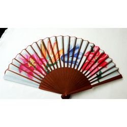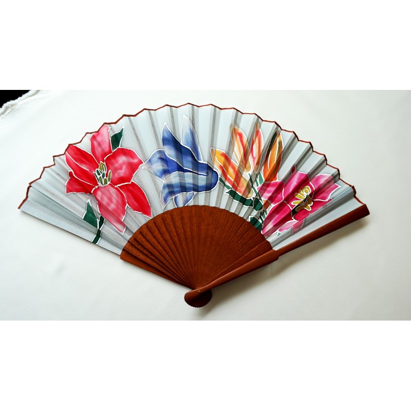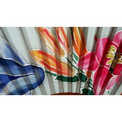 Verwöhnen Sie sich mit diesem ausdruckvollen Fächer in silber-grau. Eine silberne Umrandung verschönt die großen Blüten in pink, orange und blau. Das Gestell aus Bokapi wirkt sehr edel. Unwiderstehlich!