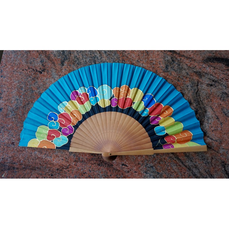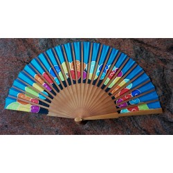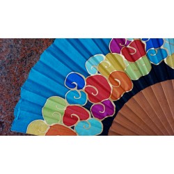 Petrol ist die Fächerfarbe mit gold eingefassten Blüten - auf Seide gemalt. Geschliffenes Birkenholz hält die Bespannung. Hier werden Träume wahr.