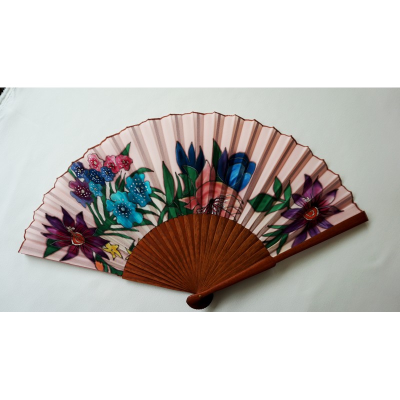 Es lebe der Glanz! Schon alleine das fein geschliffene und polierte Tropenholz lassen mit seiner dunklen Struktur die außergewöhnlichen Farben dieses Fächers zur Geltung kommen. Handbemalte Seide auf rosafarbenem Grund, das sind Blüten und Blätter in rosarot, dunkelrot, türkis, blau und grün – kunstvoll verschönert mit wenigen silbernen Applikationen. Ein großer Traumfächer!