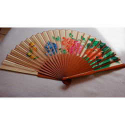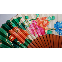 Groß und edel präsentiert sich dieser ausgefallene Fächer mit traumhaften Blüten und Blättern auf hellem Grund. Blüten und Blätter wie auch die beiden Schmetterlinge sind goldfarben eingefasst. Diese Handmalerei wird ausdruckvoll von poliertem Tropenholz hervorgehoben. Hier werden Träume wahr.
