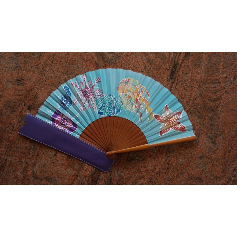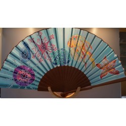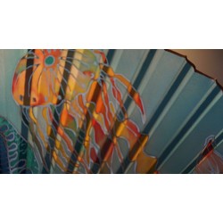 Tauchen Sie ab in die Tiefen des Ozeans. Vielleicht finden Sie die Meerestiere unseres Fächers wieder. Die Farben gelb, hell- und dunkelrot, blau, grün und lila mit silberfarbenen Umrandungen - auf hellblauem Grund - sorgen dafür, dass dieser Fächer zu einigen Ihrer Kleidungsstücke passt. Erfrischend schön!