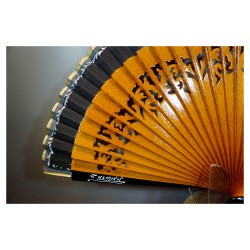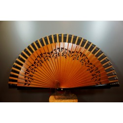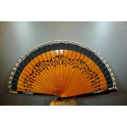 Dieser typische Herrenfächer punktet durch lackiertes Birkenholz mit ausgefallenen Durchbrüchen. Nur ein schmaler Rand aus Baumwolle in verschiedenen, Farbtönen mit goldenem Steifen und weißen Applikationen hebt die Strenge des Fächers auf. Die Deckstäbe passen zum Farbton der Baumwolle. Das passende Etui geört dazu.