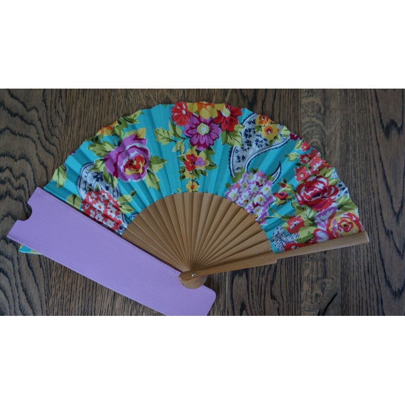Das ist der Frühling! Grundlage der Bespannung ist die Hintergrundfarbe türkis, bemalt mit großen Blüten in orange, rot und gelb. Zartes Blattgrün hebt sich ab mit grau-weißen Ornamenten. Ist er nicht hübsch? Und jetzt mit dem passenden Etui in rosa.