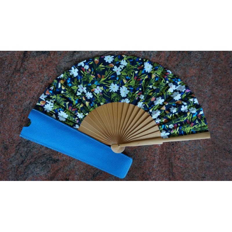 Ein neuer Fächer für den Sommer? Fein geschliffenes und poliertes Holz trägt die Bespannung aus fester Baumwolle. Auf schwarzem Grund verteilen sich viele bunte Blüten und grünes Gras. Die dominante Farbe der blühenden Pracht ist weiß. Der perfekte Fächer für jeden Tag. Und jetzt als Set mit dem passenden Etui RL_23 in kräftigem mittelblau (capri)