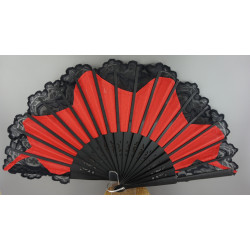 Hier ist ein Flamencofächer in normaler Größe mit 24 cm. Gute Verarbeitung, das Gestell wurde schwarz lackiert. Die rote Bespannung aus Baumwolle wird klassisch eingerahmt von schwarzer stabiler Spitze. Der Bügel macht das Modell perfekt.