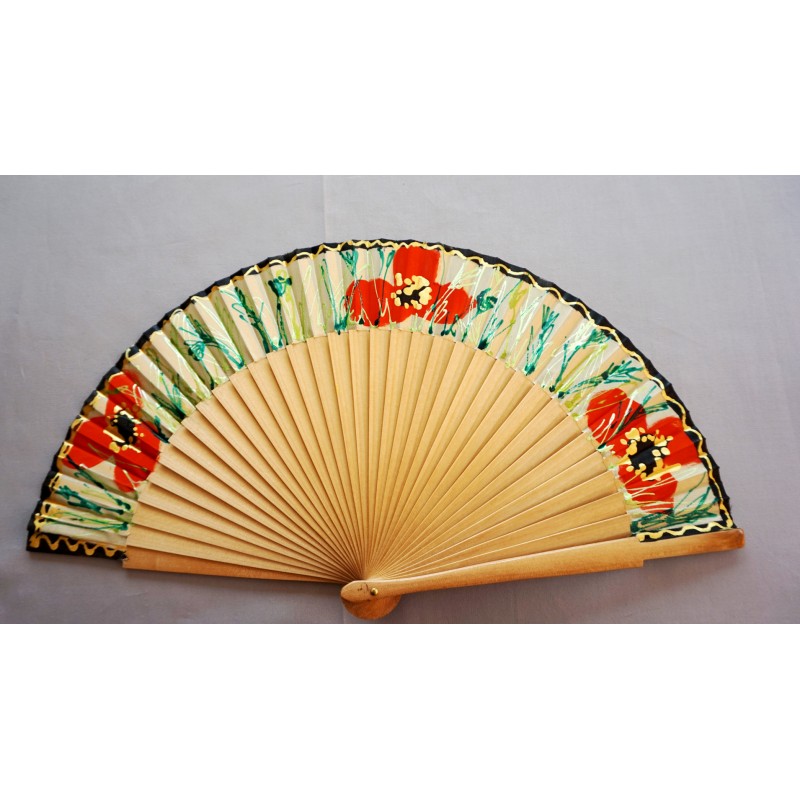feuriger Fächer! Das Modell ist hellbraun lackiert. Die Bordüre - passend zur Lackierung weist sprühende goldene Strahlen auf. Viel moderne Kunst, wenig Blüten. Beim hellbraunen Fächer sind die Strahlen türkisfarben.