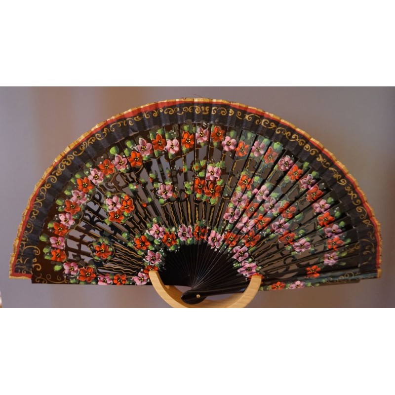 DIESER FÄCHER IST IM PREIS REDUZIERT, weil er nicht akkurat verarbeitet wurde. Schwarze Lackierung mit Durchbrüchen und eine Bemalung aus rosa und roten Blüten und grünen Blättern. Das Model ist beidseitig bemalt. Der Fächer lässt sich leicht öffnen und schließen.