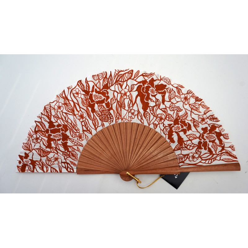 Designerfächer - Dekorative Bemalung von modernen Blüten und Blättern erwartet die Trägerin dieses Modells. Den Fächer gibt es mit schwarzer oder brauner Bemalung auf hellem Baumwollgrund. Das Modell verleiht ein zeitloses Gefühl von Luxus und Eleganz.