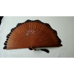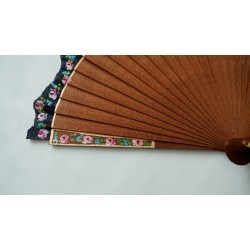 Moderner Rosenfächer - Bestechend schlicht wirkt das lasierte Tropenholz. Ein wellenförmiges Baumwollband in schwarz mit kleinen Rosen verschönt den Abschlussrand. Gleiche Verzierungen gibt es auch auf dem Deckstab und auf der Rückseite. Die Goldkante gibt eine klare Linie vor. Superleichter Lauf. Eine wertvolle Arbeit.
