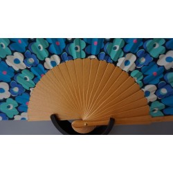 Ist Blau Ihre Lieblingsfarbe? Vielleicht gefällt Ihnen dieser hübsche Fächer? Das geschliffene Holz gibt den Halt für die bedruckte Bespannung aus Baumwolle. Weiße, türkisfarbene und blaue Blüten mit rosa Punkten verteilen sich über den gesamten Fächer.