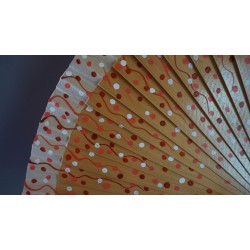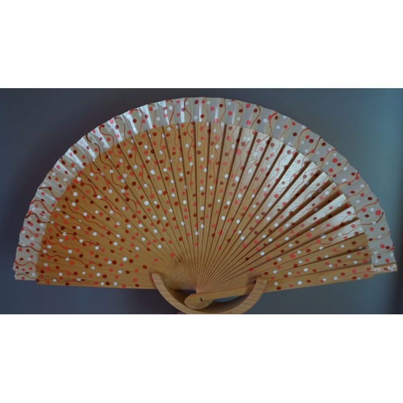 Dekorative Punke verleihen diesem Modell das gewisse Etwas! Lackiertes Holz – die Grundfarben sind schwarz, rot und hellbraun Die Rückseite ist matt lackiert, die Vorderseite glänzend. Weiße, rosa und dunkelrote Punkte verbreiten sich über den gesamten Fächer. Genießen Sie das pure Vergnügen..