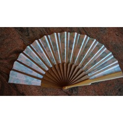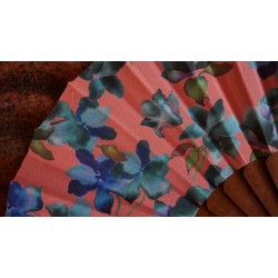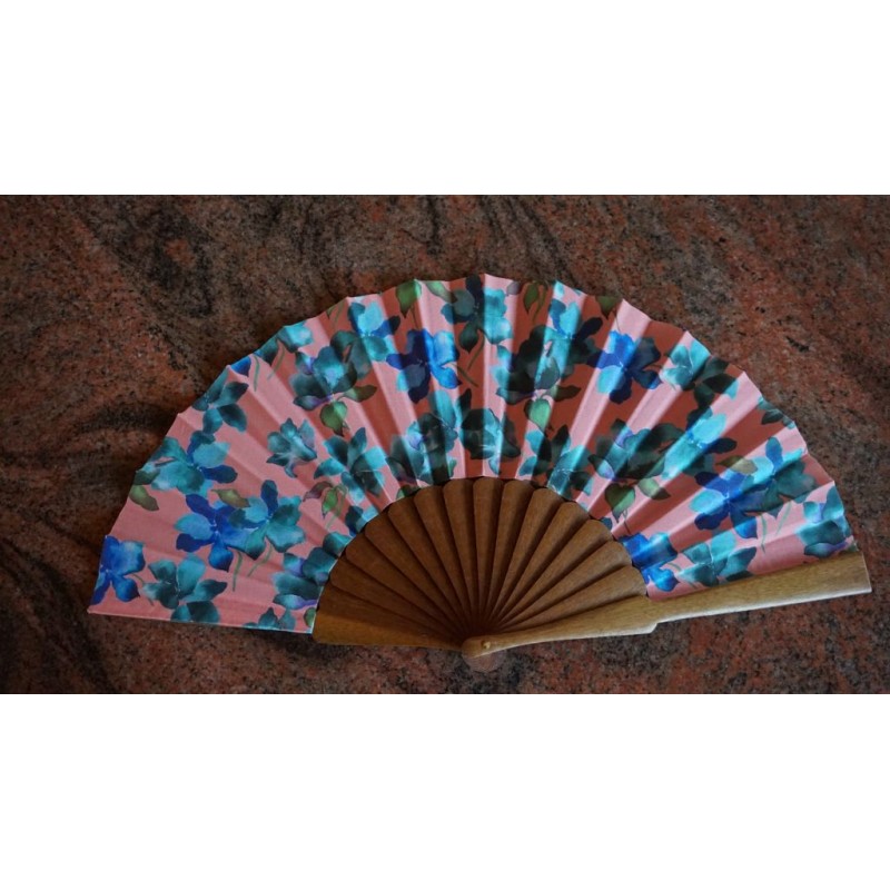 Ein Traum aus rosa mit blaugrünen Blüten. Die Bespannung aus bedruckter feiner Baumwolle findet ihren Halt durch ein Gestell aus fein geschliffenem und rund geschnittenem Bokapiholz mit extra breiten Stäben. Eine Perle unter den Fächern!