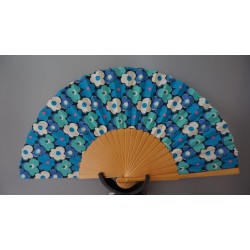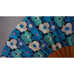 Ist Blau Ihre Lieblingsfarbe? Vielleicht gefällt Ihnen dieser hübsche Fächer? Das geschliffene Holz gibt den Halt für die bedruckte Bespannung aus Baumwolle. Weiße, türkisfarbene und blaue Blüten mit rosa Punkten verteilen sich über den gesamten Fächer. Mit pinkfarbenem Etui kommen die Punkte besonders zum Vorschein.